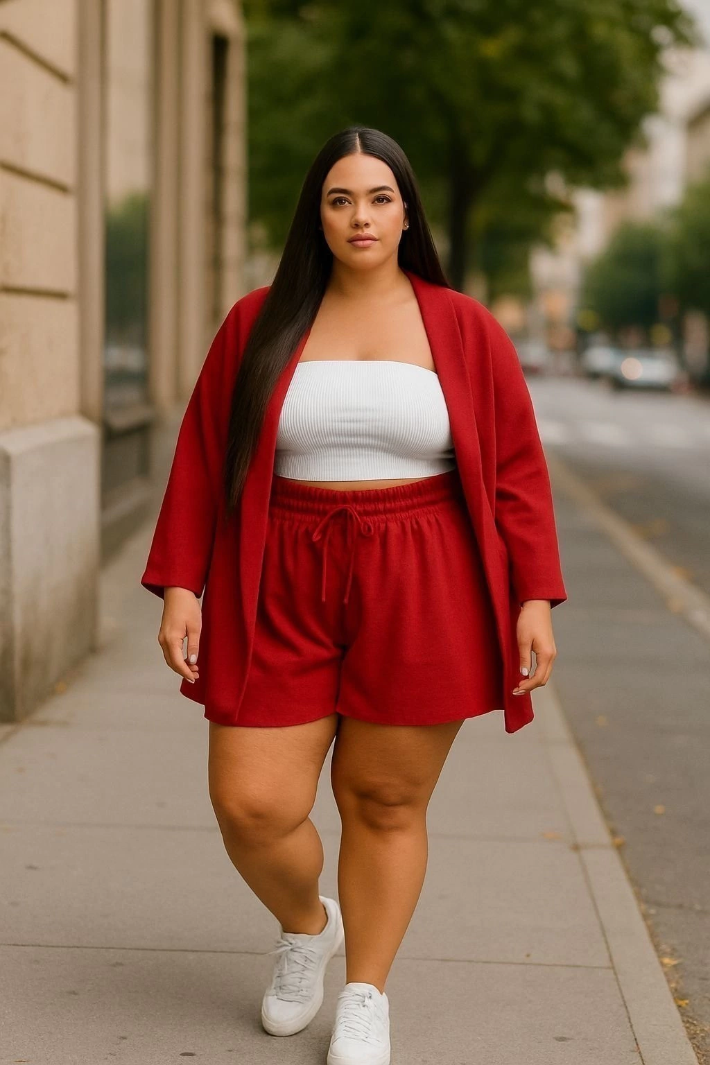 Composto por kimono alongado + top faixa + short godê, é aquele conjunto que se adapta a qualquer ocasião — do casual ao sofisticado.